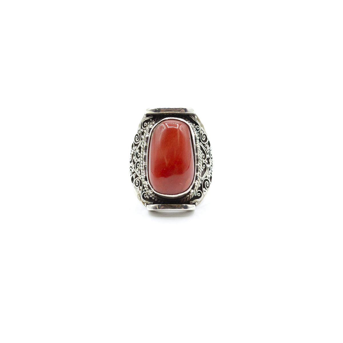 ANEL EM PRATA 925 BEM TRABALHADA COM FILIGRANA E UMA PEDRA OVAL DE CORAL BEM GRANDE