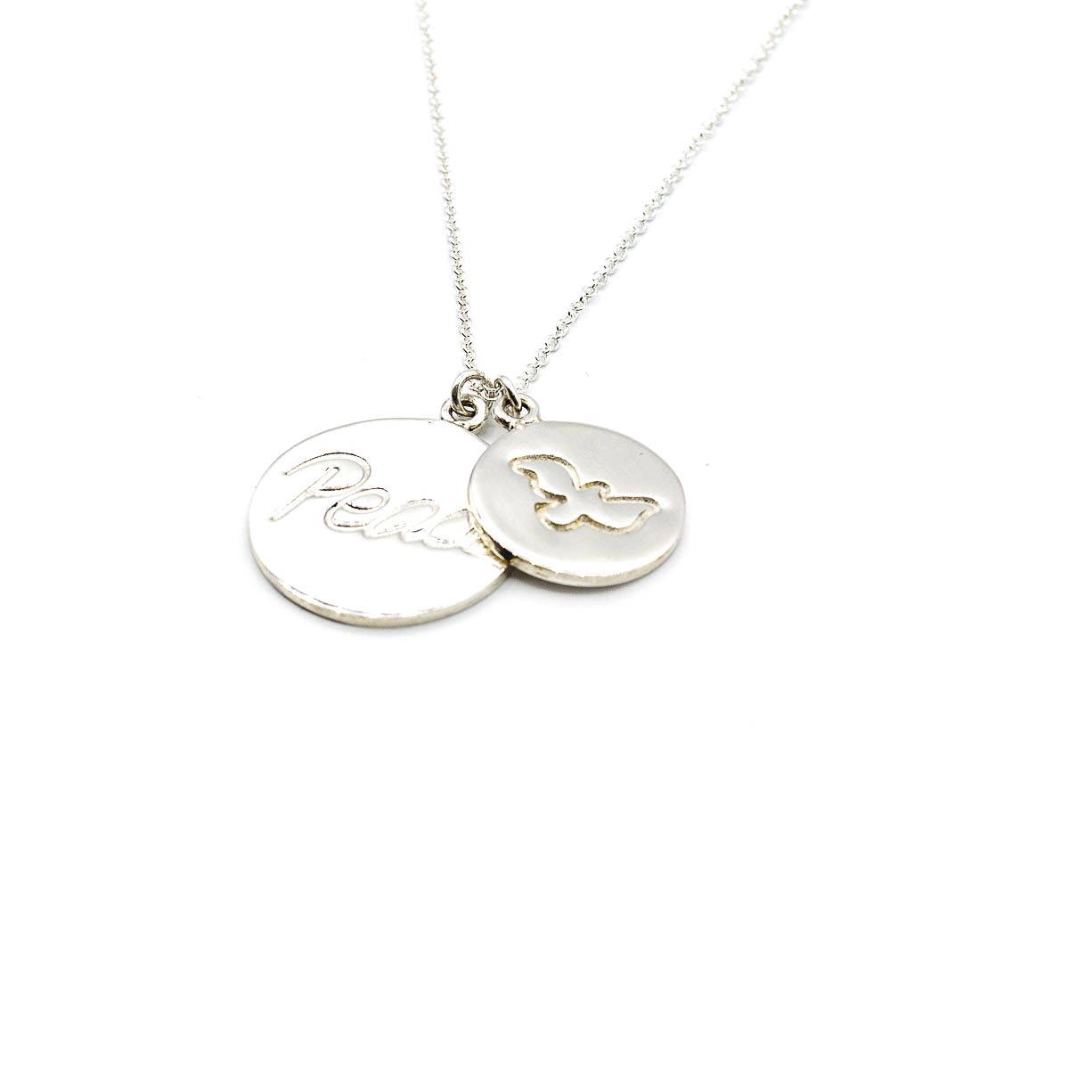 CORRENTES EM PRATA 925 COM 2 MEDALHAS, UMA DA POMBA DA PAZ E A OUTRA ESCRITO "PEACE"