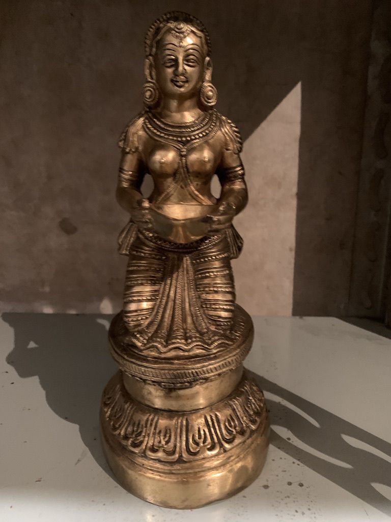 ESTATUETA DE LAKSHMI AJOELHADA EM BRONZE COM 24 CM DE ALTURA